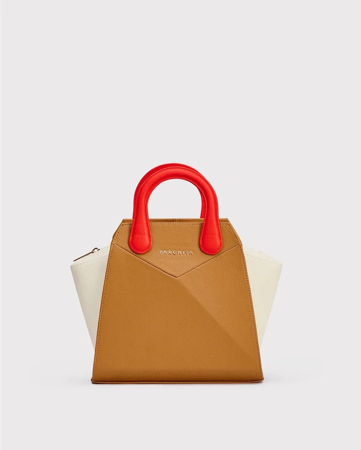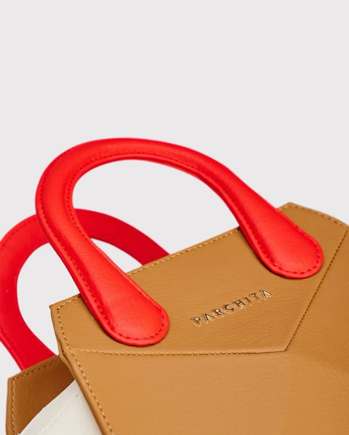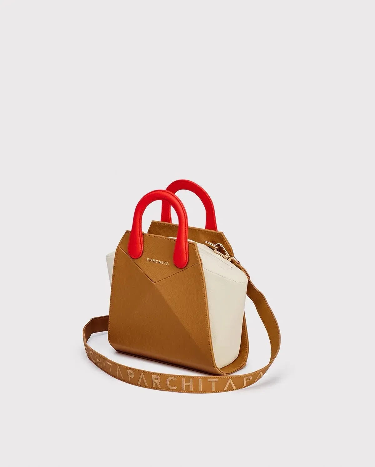 Bolso estructurado mediano de silueta geométrica tipo trapecio, con un diseño moderno y distintivo gracias a sus cortes en líneas diagonales. Cuenta con doble asa corta redondeada y un trap removible y ajustable bordado, ideal para llevar al hombro o cruzado, además, tiene un bolsillo tipo parche en...