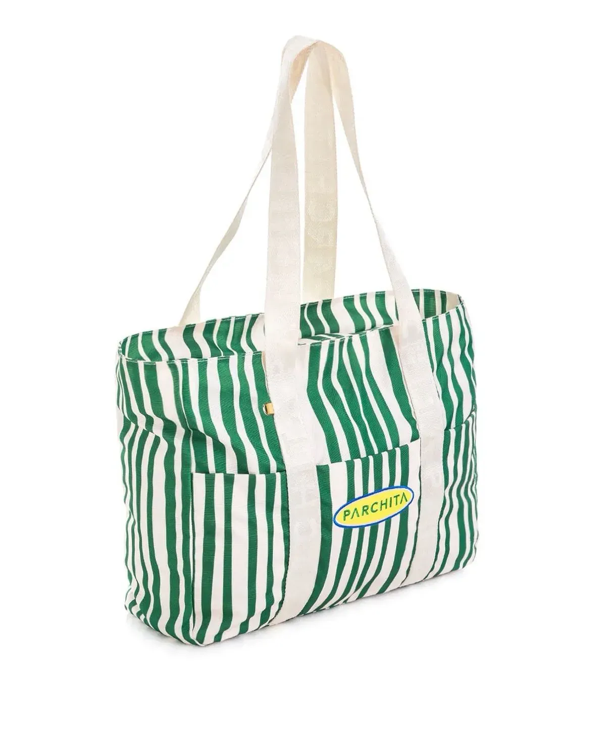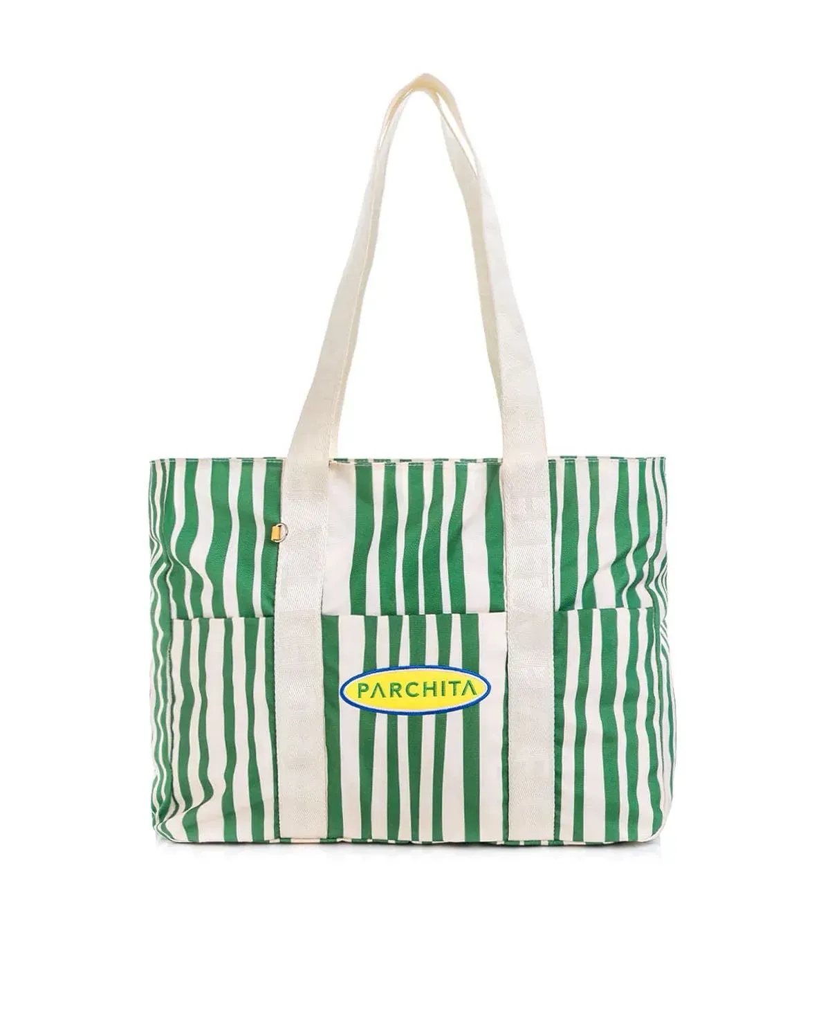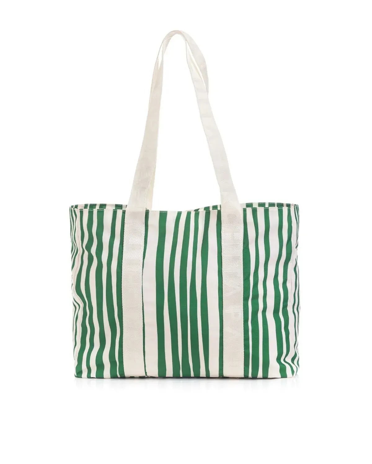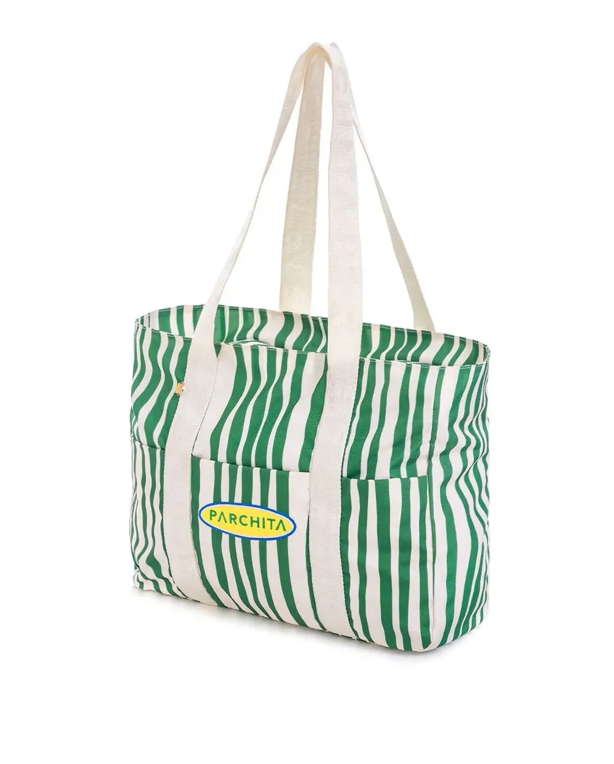 Shopping Bar ú en lona sublimada y asas en nylon, bordado con un lindo pez icónico de la colección. Cuenta con una media argolla para colgar charms y personalizar tu bolso. Disponible en tres colores, es ideal para un día de sol, mar y playa, cargando todos tus esenciales sin perder el estilo.