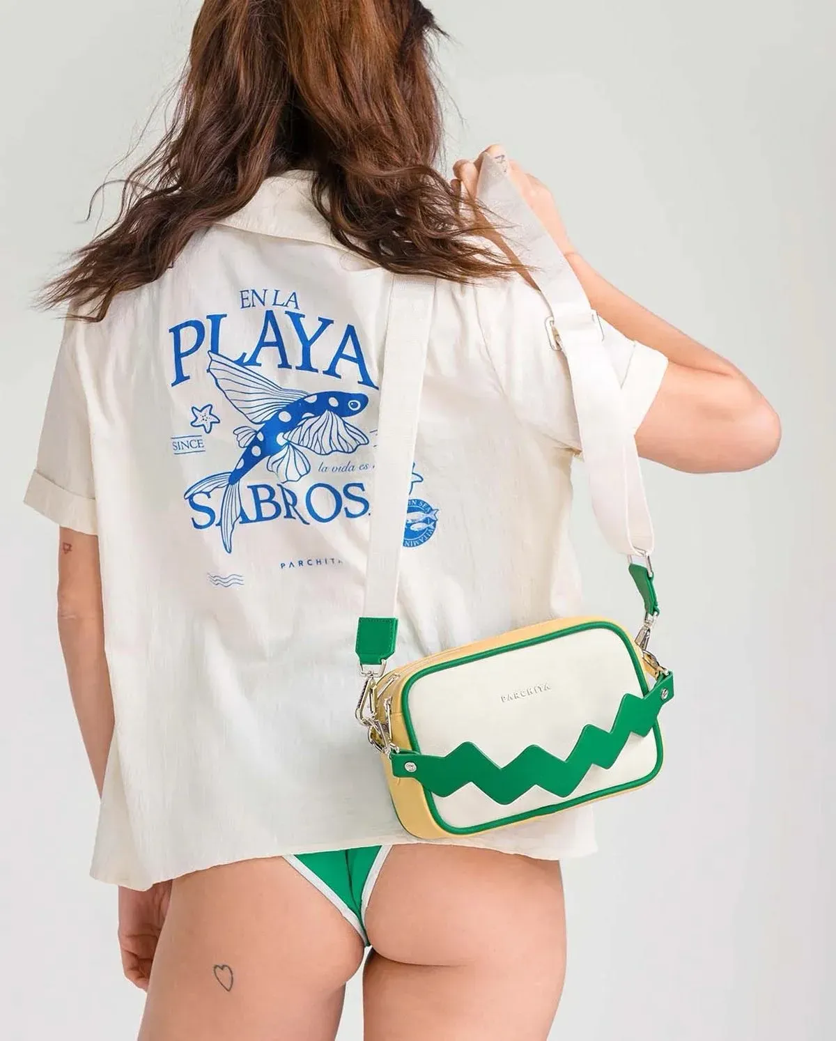Bandolera para mujer tamaño mediano con dos bolsillos centrales, strap ajustable y asa en zigzag .