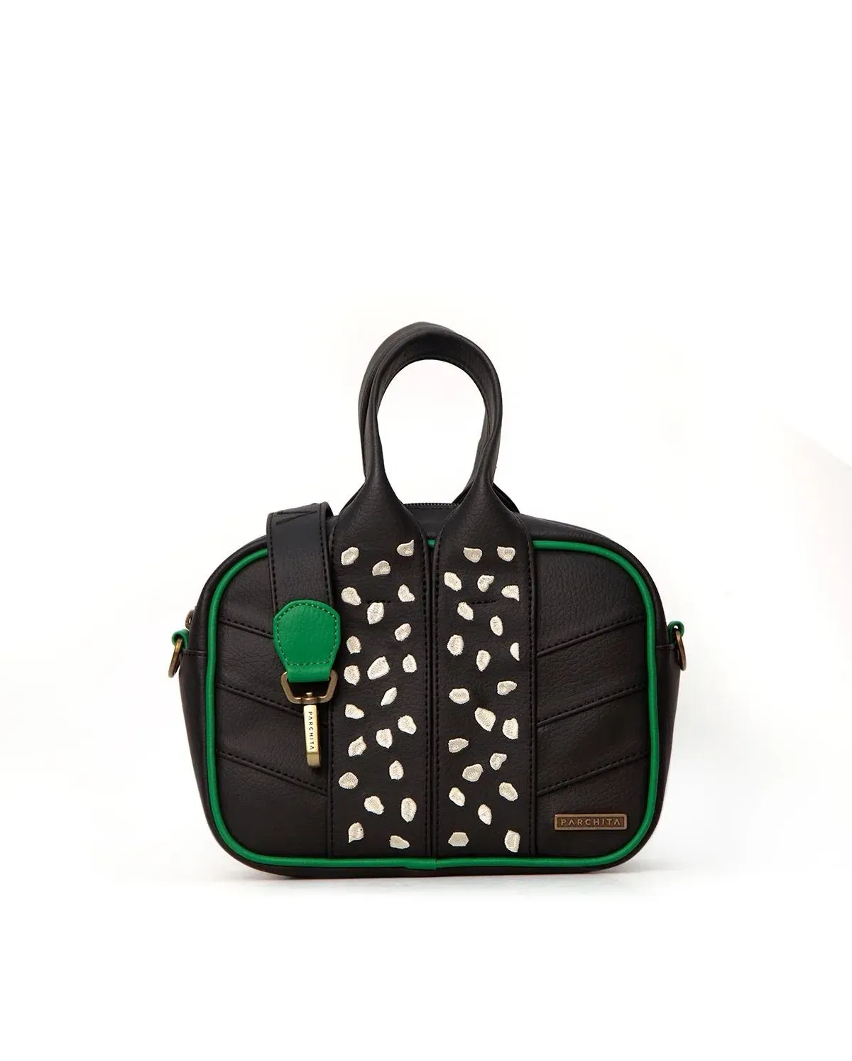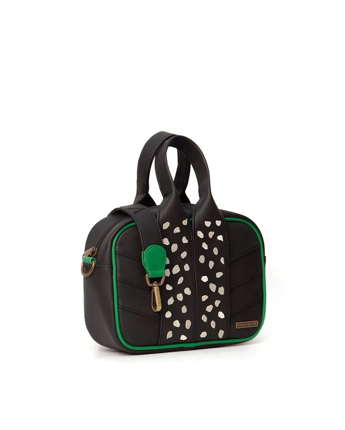 Es una bandolera pequeña y funcional, que cuenta con dos asas en pvc bordadas con manchas en contraste, strap removible y ajustable bordado, que te permite decidir cómo llevar tu bandolera, detalle de sobre puesto en delantero y bolsillo parche interno, la hace una bandolera práctica y versátil para...